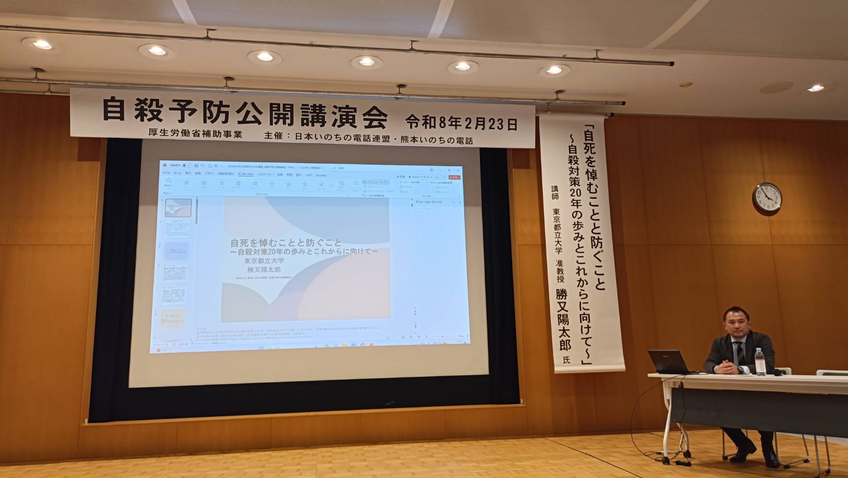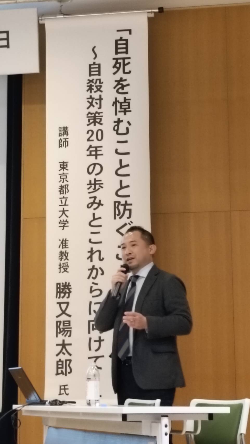 講師は、東京都立大学の勝又陽太郎先生。演題は「自死を悼むことと防ぐこと〜自殺対策20年の歩みとこれからに向けて〜」でした。