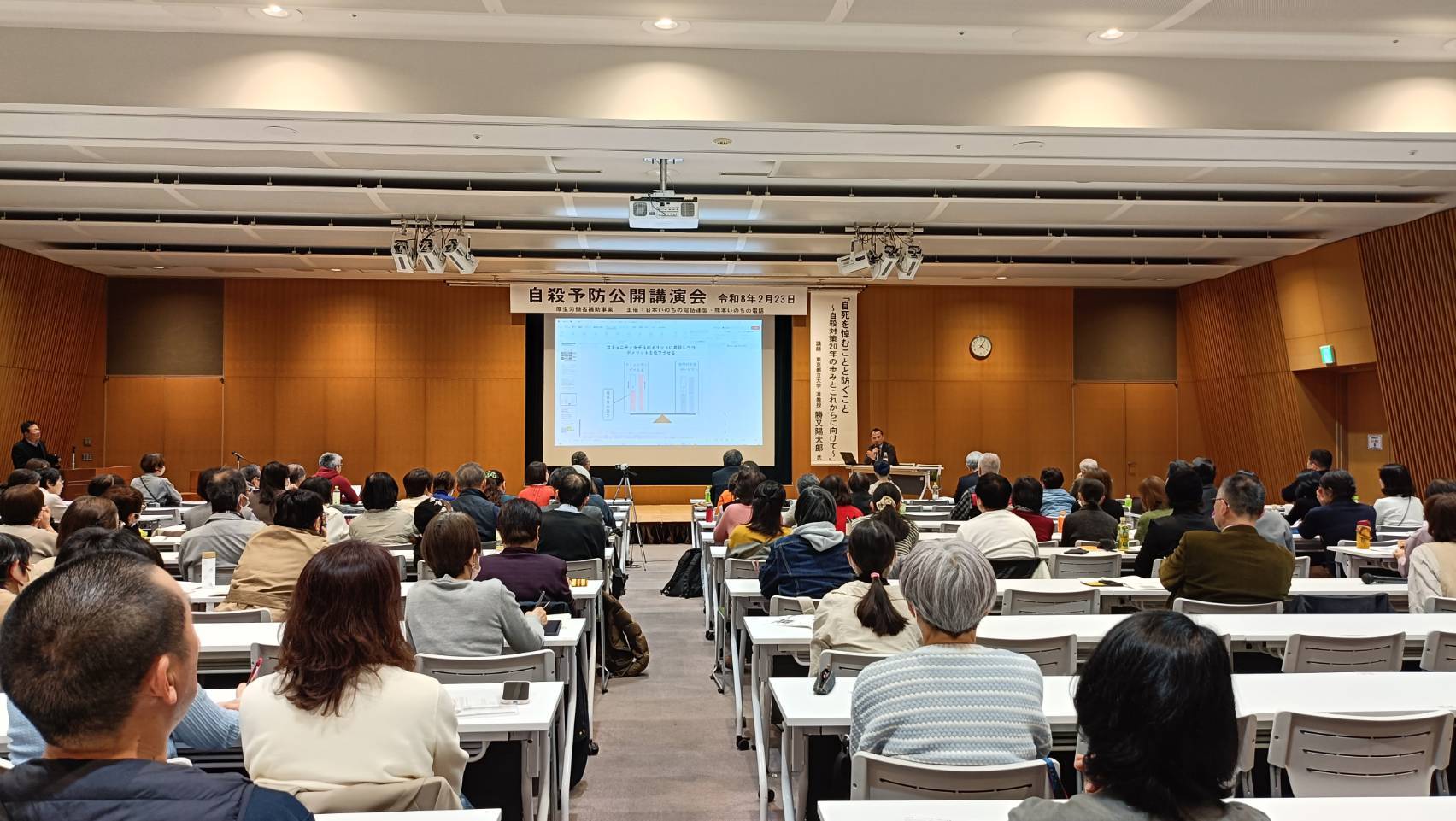 第22回熊本いのちの電話自殺予防公開講演会を、2月23日(月・祝)、くまもと県民交流館パレア・パレアホールにて開催し、149名の皆さまにご参加いただきました。